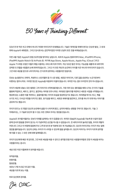 애플 창립 50주년(4월 1일)을 앞두고 팀 쿡이 쓴 편지.