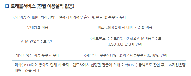 IBK기업은행의 나라사랑카드의 경우에는 무실적 해외수수료 면제+환율우대까지 들어가있기도 하고....