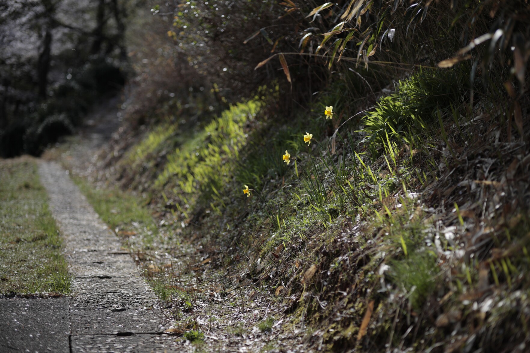 白川沿いで咲く花いろいろ。1枚目からユキヤナギ、スイセン、ヤマブキ、スノーフレーク。