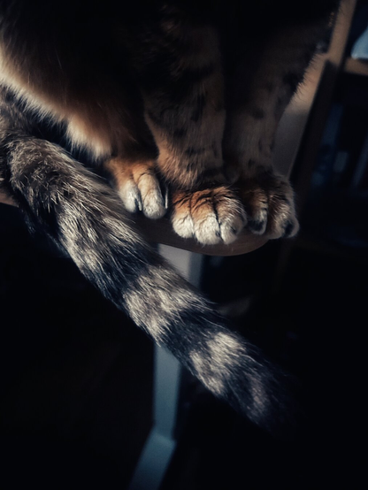 A silhouette of Oskar with him looking out of his cat tree bed. Love the ear tufts and neck floof 🥰