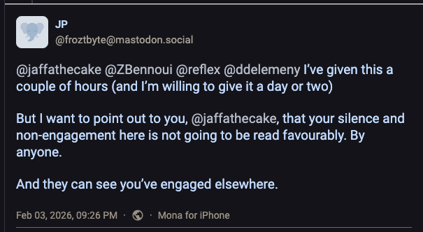 after trying (rather gently) to try highlight to them that their continued evasion irks a lot of fedi users (many of whom are keenly aware of the patterns of abuse), they went "...who? me?!"