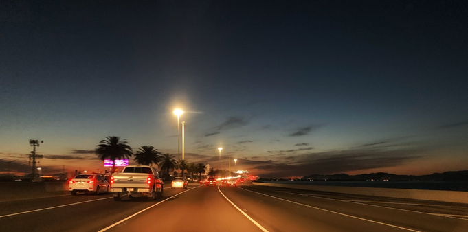 A beautiful night for a sunset hike. Clear skies overhead, but lots of haze near the ground, perhaps some from wildfire smoke.